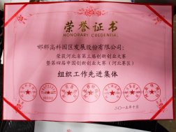 在本年度舉辦的河北省第三屆創新創業大賽暨第四屆中國創新創業大賽(河北賽區)決賽中,邯鄲高科園憑出色組織工作,榮獲大賽的組織工作先進集體獎。 河北省第三屆創新創業大賽暨第四